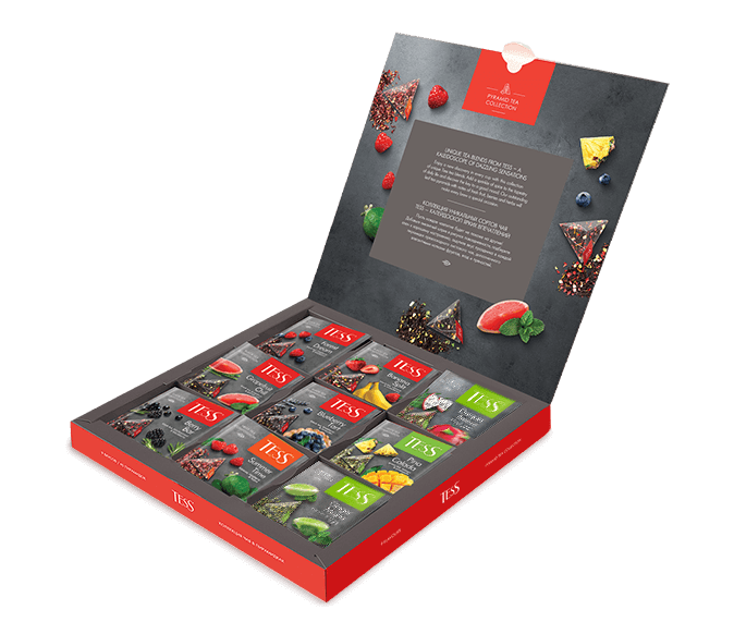 Una colección de exquisitas composiciones de té a base de té negro, verde y de frutas y hierbas, en las que se combinan armoniosamente excelentes hojas de té con trozos de frutas y bayas, pétalos de flores, hierbas aromáticas y especias. Cada pirámide contiene una porción perfectamente medida de té de hojas sueltas para preparar en una taza.